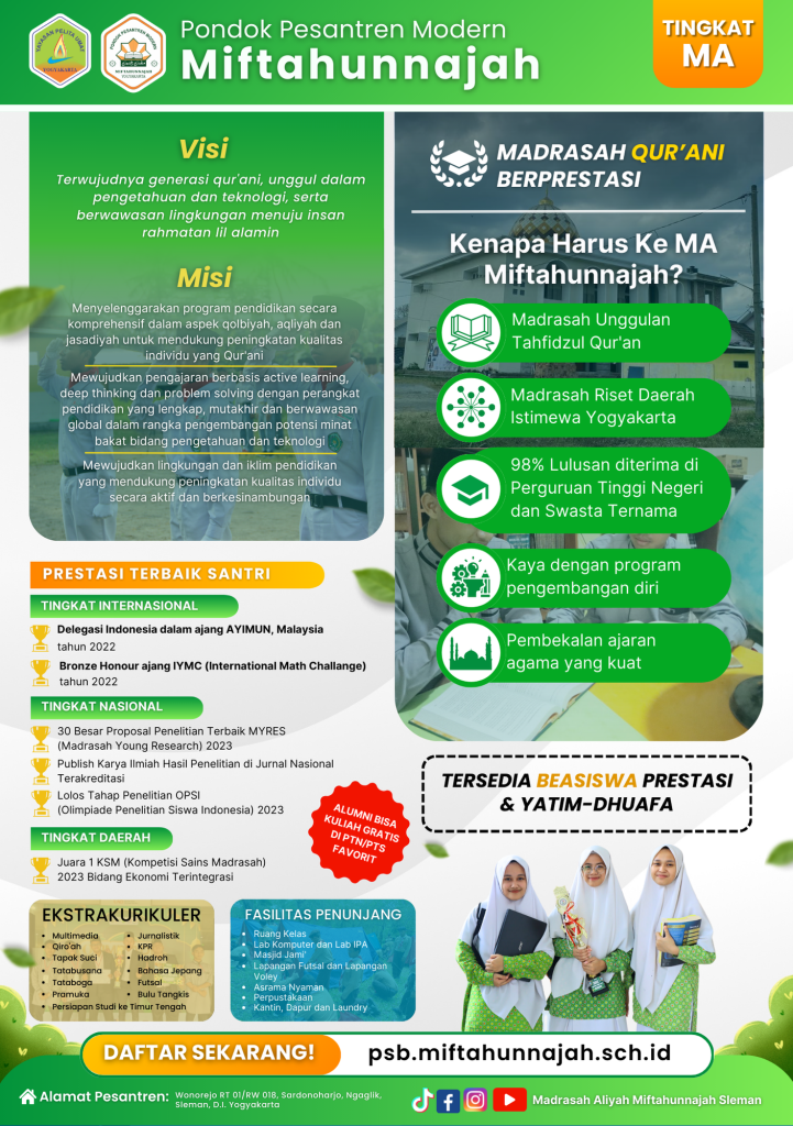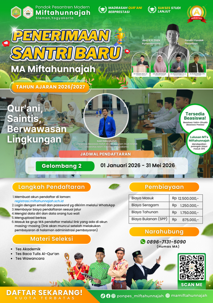 Calon santri yang berhak mendaftar di unit MA Miftahunnajah adalah yang saat ini sedang duduk di kelas IX (Sembilan) SMP/MTs/sederajat dan berpeluang lulus atau telah memiliki ijazah SMP/MTs/sederajat maksimal 3 tahun terakhir